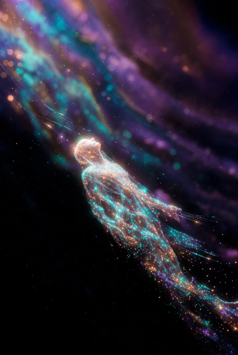 Awakening — that irreversible moment when you can no longer see yourself or the world the way you once did — rendered as a golden figure rising from darkness, expanding in brightness as it ascends, warm light breaking free from below, background transitioning from void black to rich cosmic indigo.