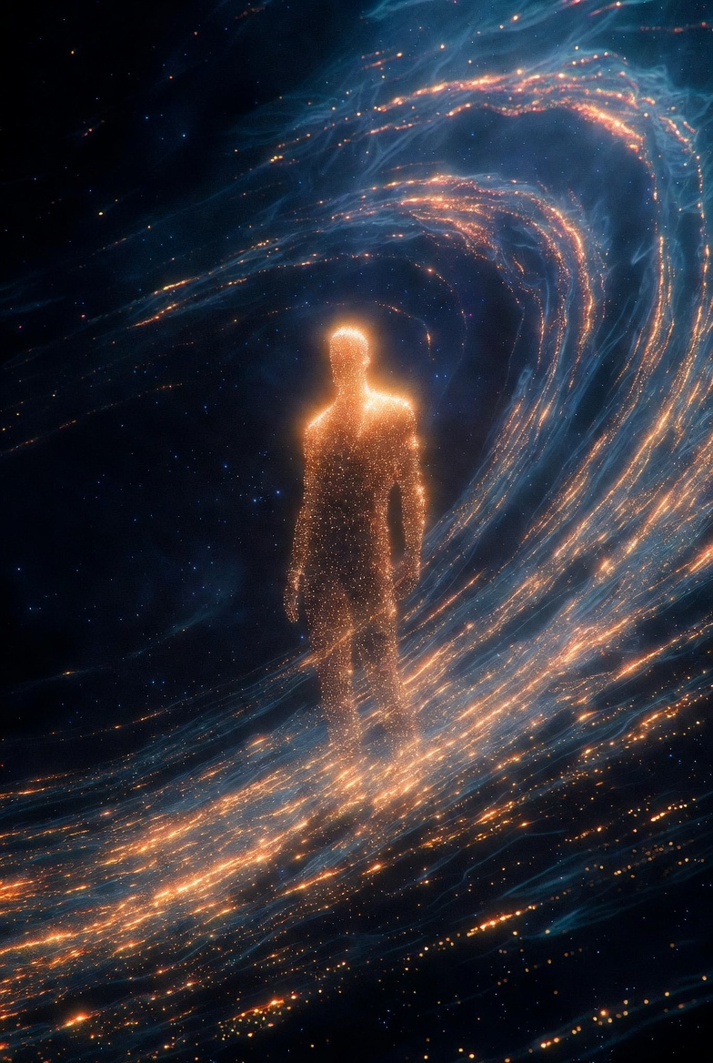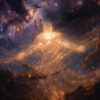 Belonging renders that moment as luminous fine art — a being of pure gold light, perfectly still, while the cosmos orients itself to receive them.
