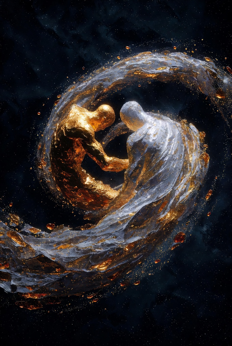 Eternal Love is the rarest kind — love that has survived everything and still burns. Two ancient figures of deep gold and silver light intertwined in an endless spiral, worn smooth like river stones, orbited by amber stardust against infinite midnight blue.
