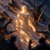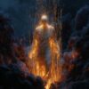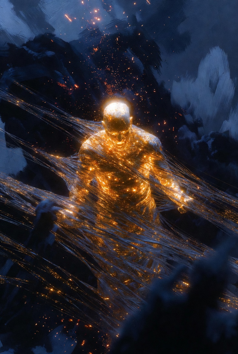 A golden figure frozen mid-motion — threads of light pulled taut across its body like bindings, embers scattering through dark blue storm clouds. Not fleeing. Not fighting. Just the raw, honest paralysis of facing something you cannot control. A single limited edition.