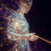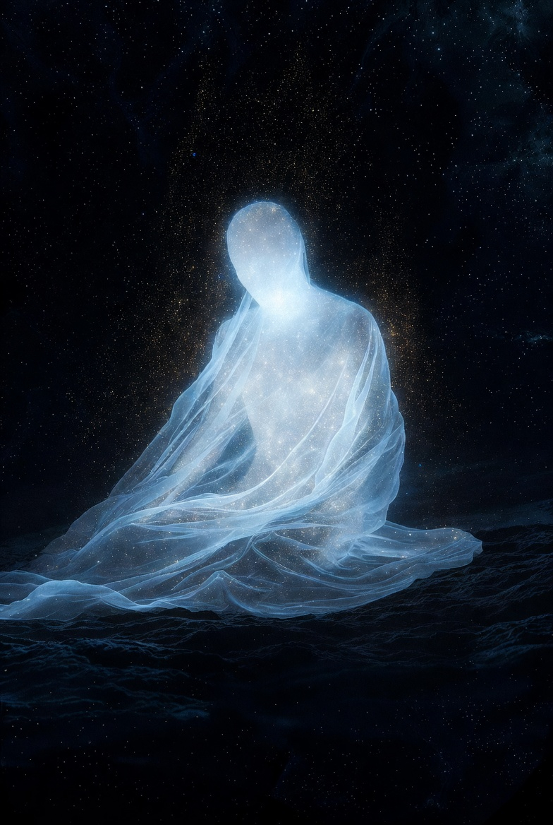 Inner Peace — that rare, hard-won state of complete stillness within regardless of the noise without — rendered as a luminous pearl-white figure floating in absolute suspension, threads of soft light hanging motionless, almost no particles, only the faintest drift of gold at the periphery.