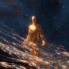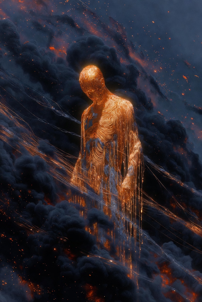 A golden figure with head bowed — its form dissolving, threads dripping downward like molten gold into billowing dark smoke. Embers drift through the air around it. Not sadness, but something richer: the bittersweet beauty of feeling everything at once. A single limited edition.