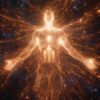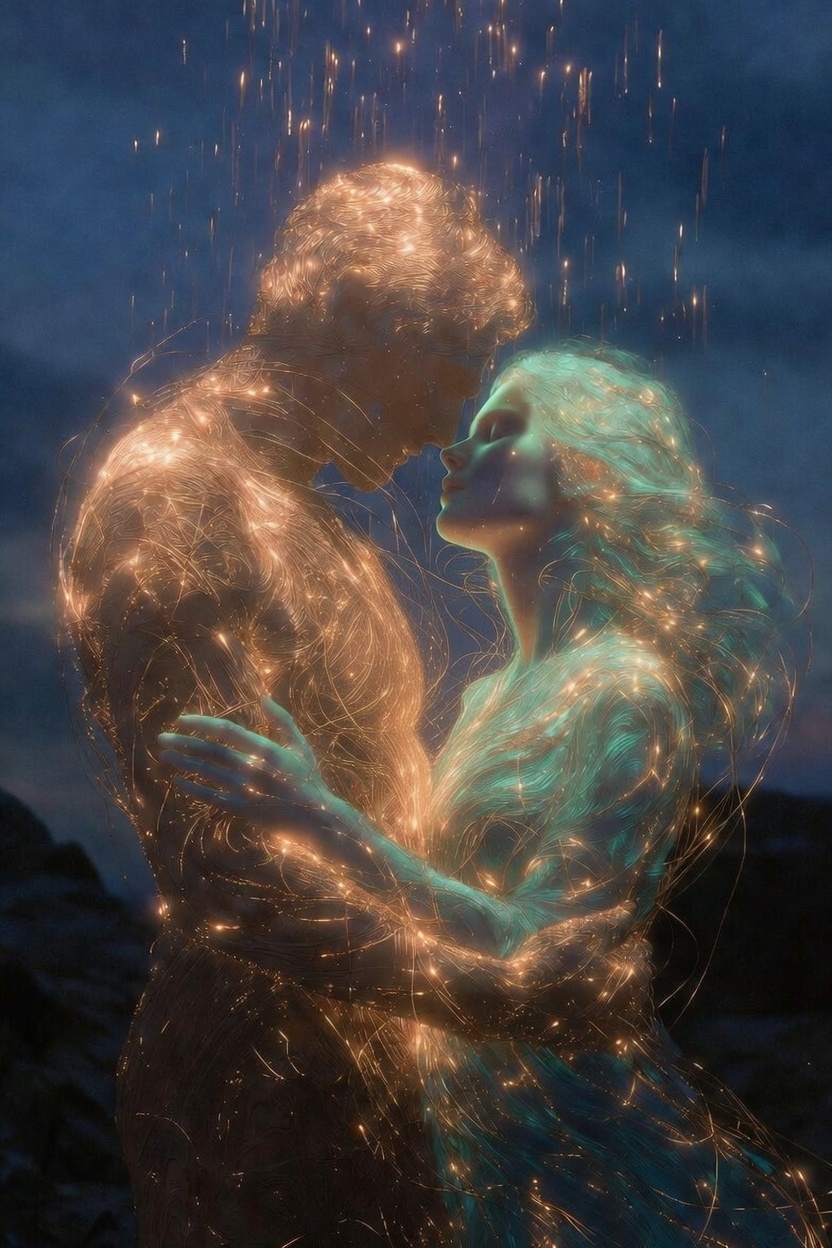 Nostalgia — that tender, aching pleasure of remembering — rendered as a golden figure gazing at translucent echoes of the past floating before them, threads connecting present to memory, particles drifting like autumn leaves.