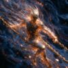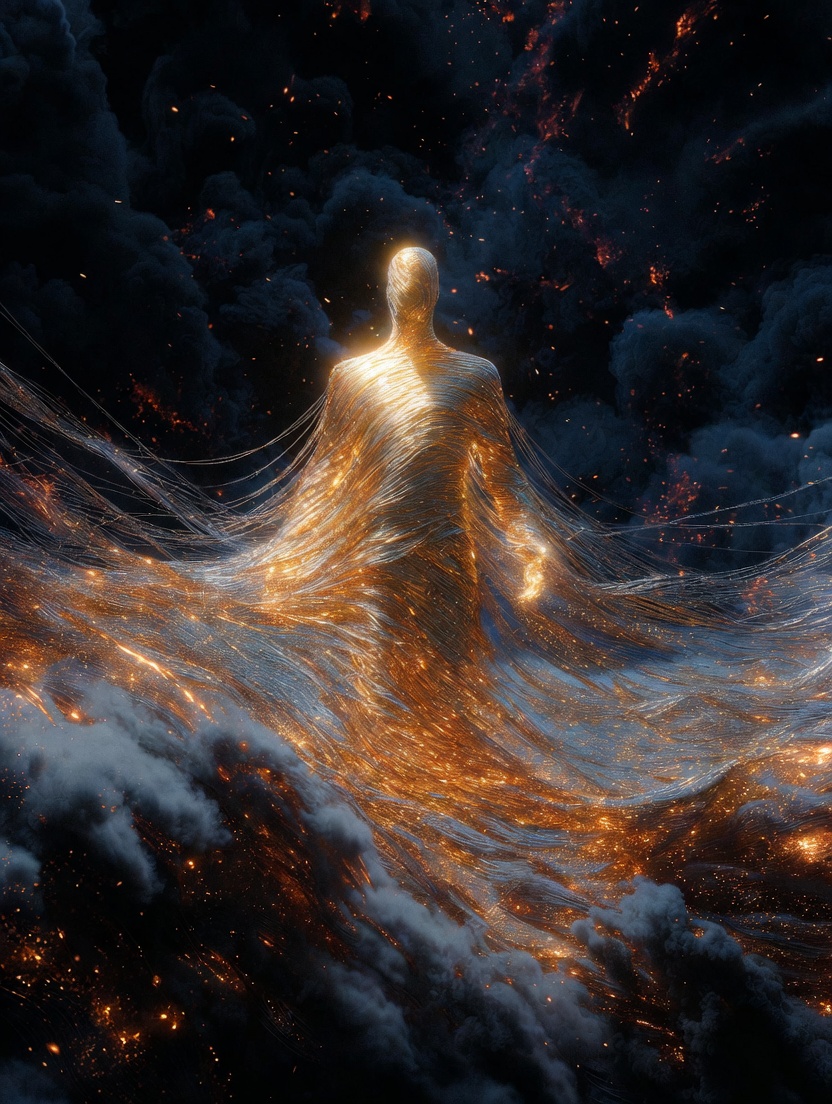 Resilience — kintsugi in living light. A golden figure cracked through its centre but blazing brightest at the fracture, new gold threads weaving across old breaks. The Japanese art of repair, rendered as luminous fine art.